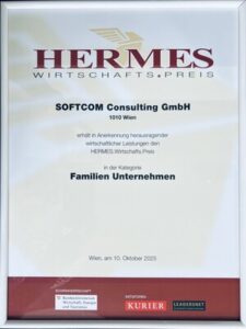 Wien (OTS) – Die Softcom Consulting GmbH wurde mit dem Hermes Wirtschaftspreis 2025 ausgezeichnet – einer der renommiertesten Preise der österreichischen Wirtschaft. Die Verleihung fand im Rahmen der Hermes Gala in der Wiener Hofburg statt und würdigt herausragende Unternehmen, die durch Innovationskraft, Wachstum und nachhaltige Unternehmensführung überzeugen.